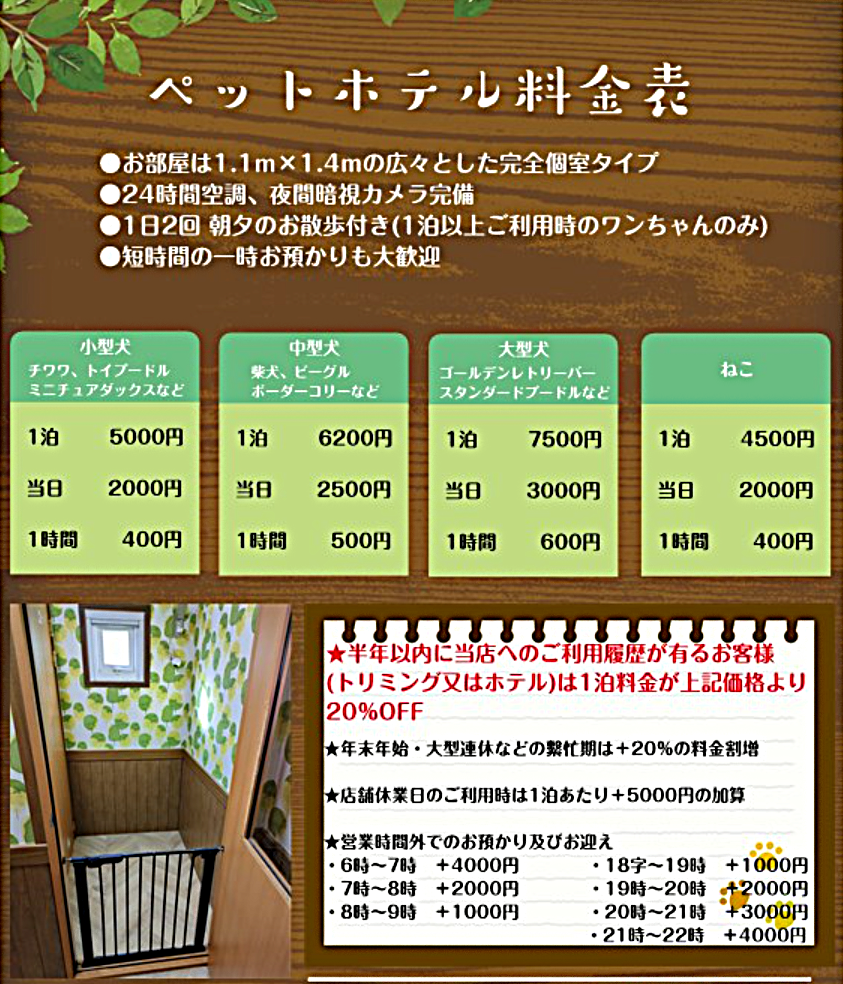 基本的には1匹につき15~20分ぐらいのお散歩が朝晩計2回となります。子犬やお散歩が苦手なワンちゃんなどの場合は店舗内(トリミングルーム)で遊んだり、併設のドッグランで運動・気分転換する形になります。